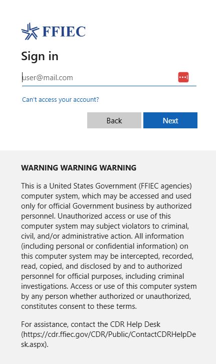 FFIEC has phased in Multi-Factor Authentication (MFA) for CDR communications. Assistance with MFA and Authenticator setup is available with the FFIEC CDR Help Desk at (888) CDR-3111 or via e-mail at [email protected]. For issues related to Microsoft Entra and Authenticator, please contact your institution’s IT support.